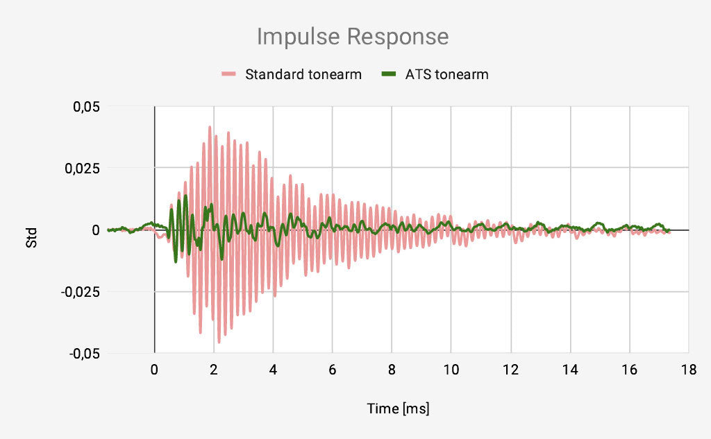 Un brazo estándar alcanza su frecuencia natural con un timbre audible, mostrando tendencias de un sistema poco amortiguado. Las pruebas de respuesta al impulso indican un sistema mejorado donde la nueva versión ATS nunca alcanza la frecuencia natural.