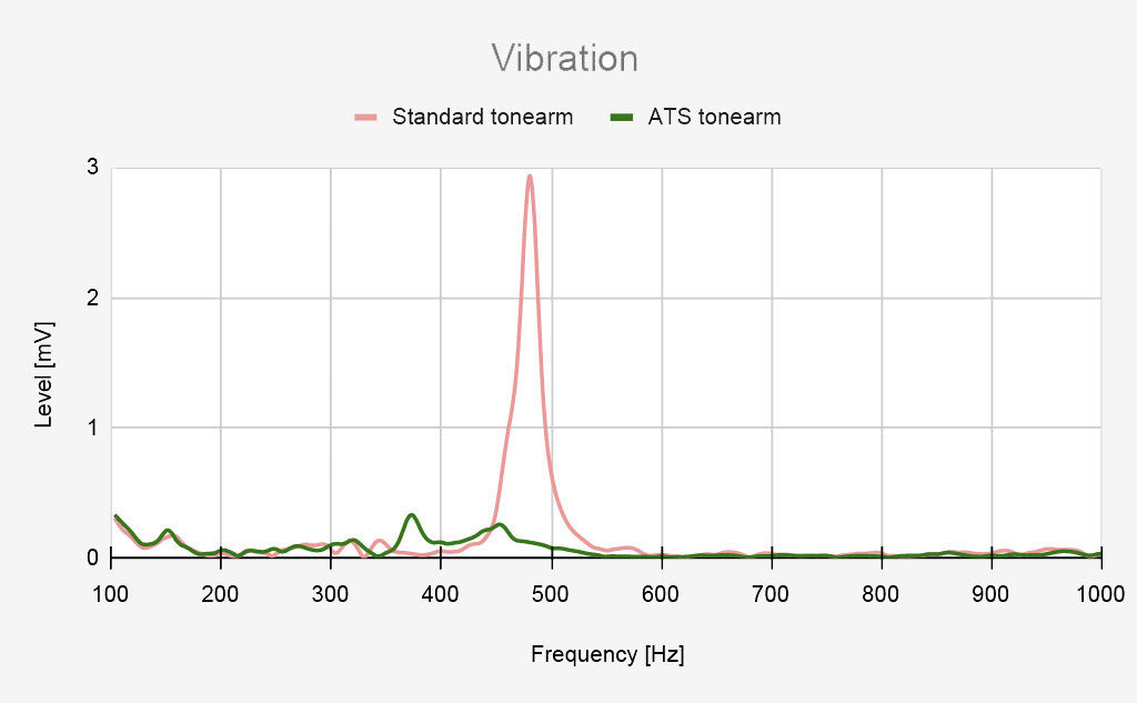 Un gráfico de respuesta de frecuencia del brazo de fibra de carbono estándar muestra una resonancia significativa a ~480 Hz. Aquí, la amplitud de la vibración perturba sonoramente la capacidad de la aguja para seguir el surco del disco de vinilo. La tecnología ATS asegura un brazo que no afecta negativamente la calidad de sonido del tocadiscos.