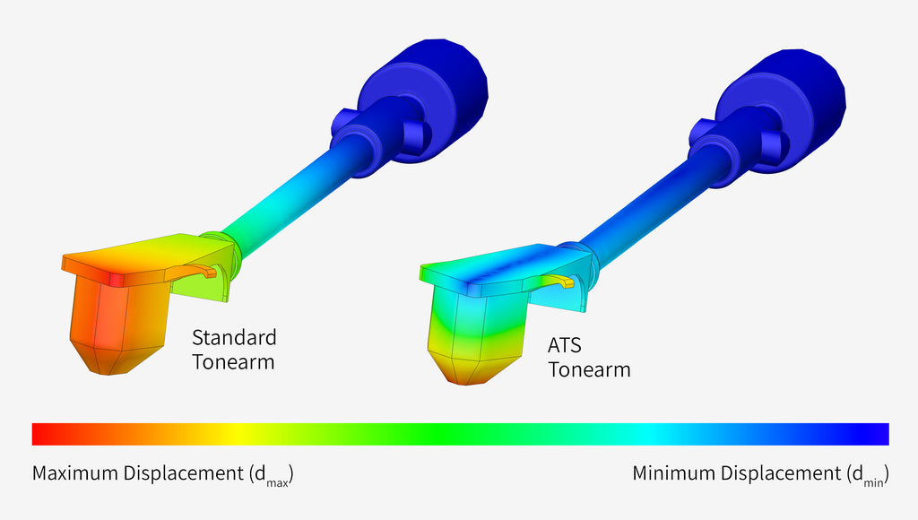 La siguiente simulación muestra un brazo fonocaptor estándar comparado con otro que utiliza nuestra tecnología ATS. El color rojo en el brazo fonocaptor estándar indica un mayor desplazamiento, lo que resulta en mayor distorsión.