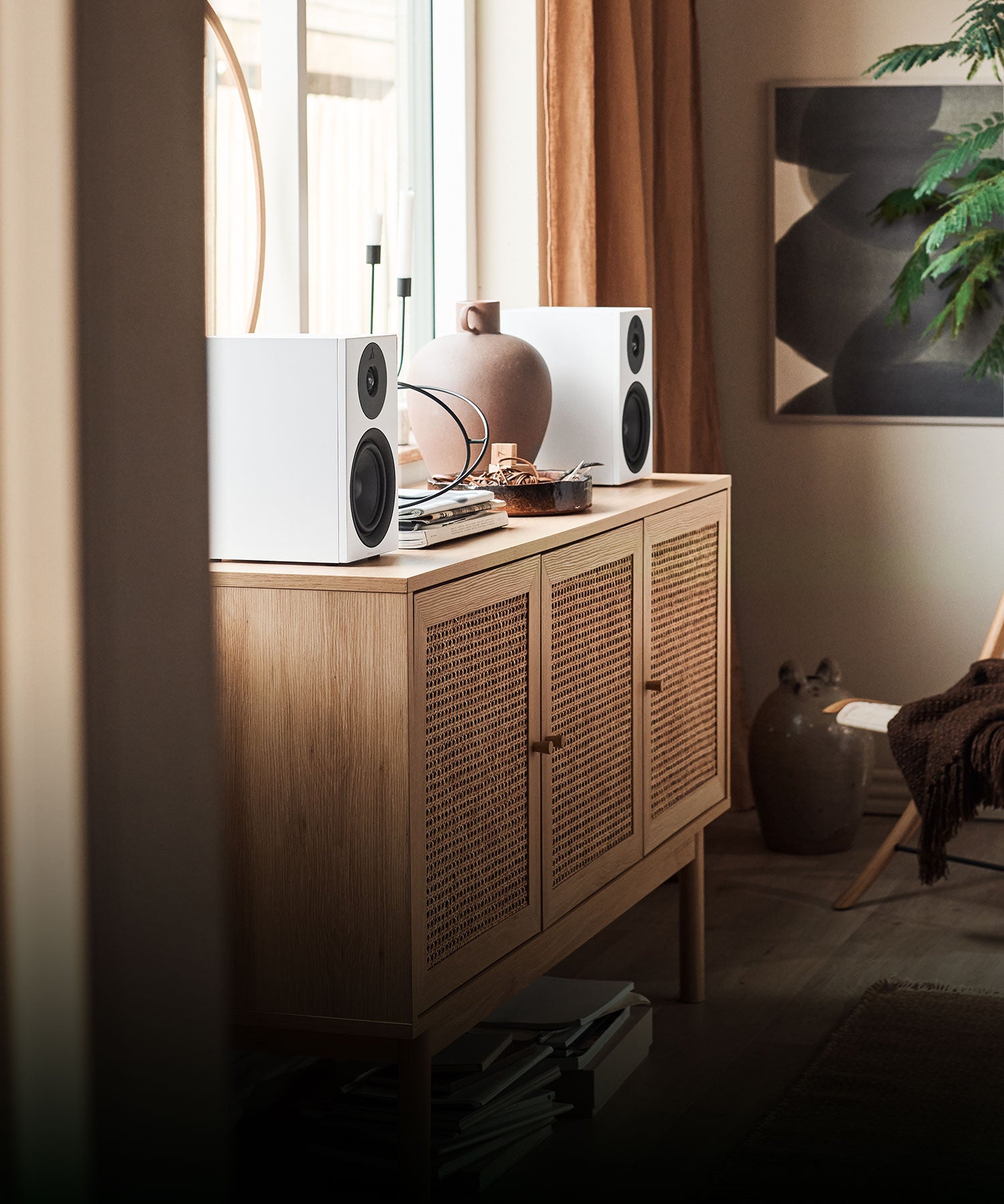 Altavoces compactos pero potentes. Ideales para configuraciones de pc, audio de TV discreto o espacios pequeños y acogedores.